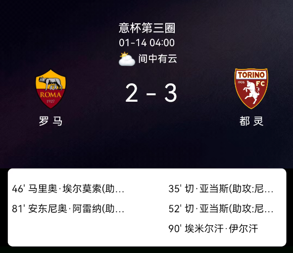 北京时间1月14日03:45,2025-2026赛季意大利杯1/8决赛,罗马主场对阵都灵。第35分钟切-亚当斯破门,0-1;第46分钟埃尔莫索破门,1-1;第52分钟切-亚当斯双响,1-2;第81分钟阿雷纳破门,2-2;第90分钟伊尔克汗破门,….....