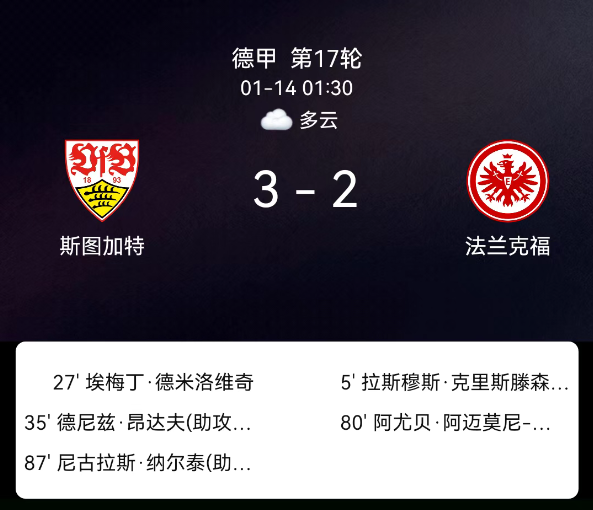 北京时间1月14日03:30,2025-2026赛季德国足球甲级联赛第17轮,斯图加特主场对阵法兰克福。第5分钟克里斯滕森破门,0-1;第27分钟德米罗维奇破门,1-1;第35分钟昂达夫破门,2-1;第80分钟埃奇古亚布破门,2-2;第87….....