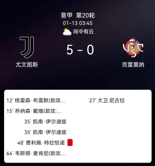 北京时间1月13日03:45,2025-2026赛季意大利足球甲级联赛第20轮,尤文图斯主场对阵克雷莫内塞。第12分钟布雷默破门,1-0;第15分钟戴维破门,2-0;第35分钟伊尔迪兹破门,3-0;第47分钟麦肯尼造乌龙,4-0;第64分钟麦….....