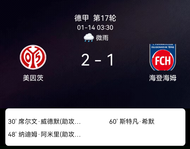 北京时间1月14日22:30,2023-2024赛季德国足球甲级联赛第17轮,美因茨主场对阵海登海姆。第30分钟威德默破门,1-0;第48分钟阿米里破门,2-0;第60分钟席默尔破门,2-1;美因茨1黄、海登海姆1黄,无红牌。最终比分,….....