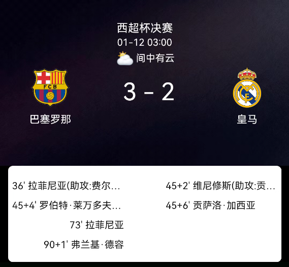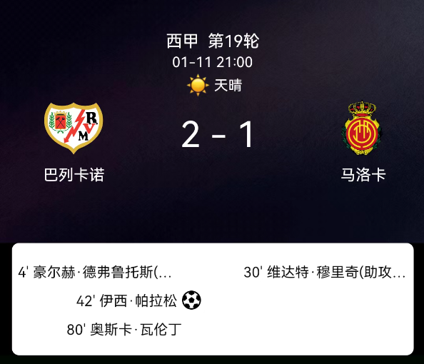 北京时间1月11日03:00,2025-2026赛季西班牙足球甲级联赛第19轮,巴列卡诺主场对阵马略卡。第4分钟德弗鲁托斯破门,1-0;第30分钟穆里奇破门,1-1;第42分钟帕拉松点射,2-1;第80分钟巴伦廷染红,巴列卡诺十人收尾;….....