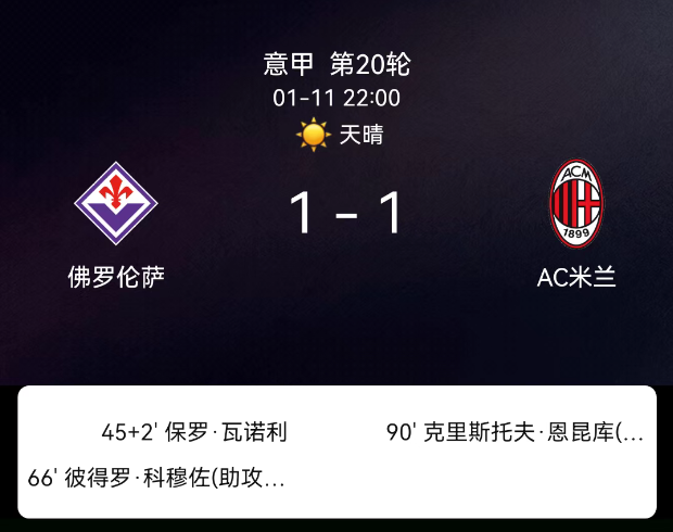 北京时间12月21日,2025赛季意大利足球甲级联赛第16轮,卡利亚里主场对阵比萨。第45分钟特拉莫尼点射,0-1;第52分钟卡利亚里领首黄;第54分钟米纳染黄;第59分钟弗洛伦肖扳平,1-1;第67分钟邦凡提领黄;第71分钟克….....