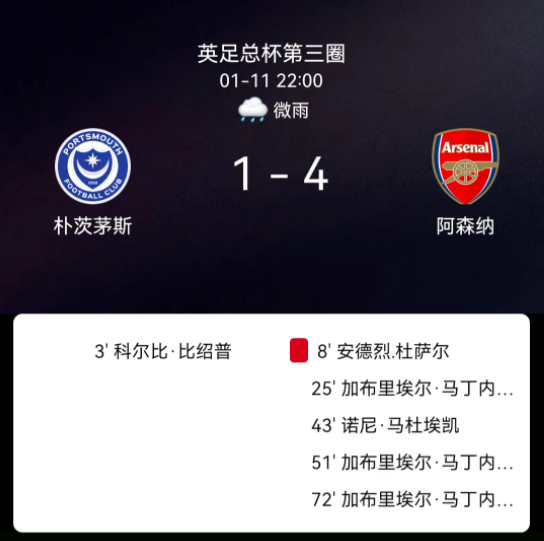 北京时间1月11日,2025-2026赛季英格兰足总杯第三轮,朴茨茅斯主场对阵阿森纳。第3分钟毕晓普破门,0-1;第8分钟多泽尔乌龙,1-1;第25分钟马丁内利破门,2-1;第51分钟马丁内利双响,3-1;第72分钟马丁内利戴帽,4-….....