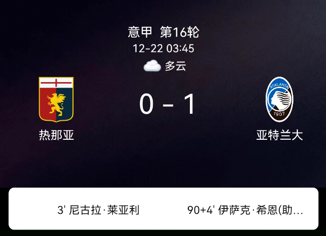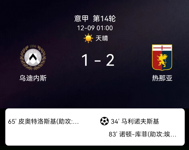 北京时间12月9日,2025-2026赛季意甲第14轮,乌迪内斯主场迎战热那亚。第34分钟马利诺夫斯基点射,0-1;第65分钟皮奥特罗夫斯基破门,1-1;第83分钟诺顿-库菲破门,1-2;双方均无红黄牌。最终比分,乌迪内斯1-2热那亚….....