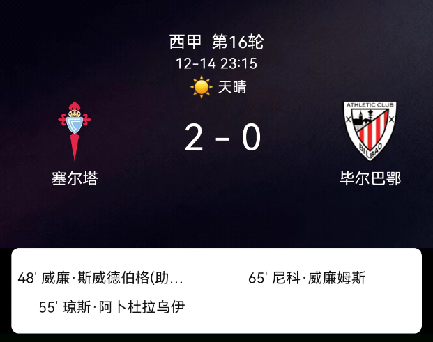 北京时间12月14日,2025赛季西班牙足球甲级联赛第16轮,塞尔塔主场对阵毕尔巴鄂竞技。第48分钟斯韦德贝里头球破门,1-0;第55分钟阿卜杜勒拉维破门,2-0;塞尔塔3黄、毕尔巴鄂竞技2黄;无红牌。最终比分,塞尔塔2-0毕….....