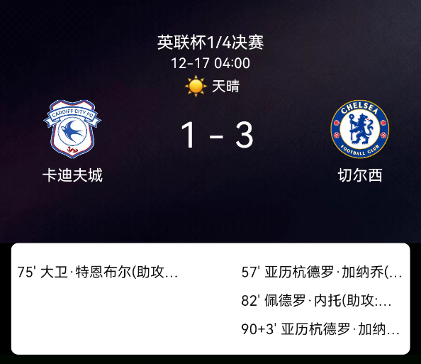 北京时间12月17日,2025赛季英格兰联赛杯1/4决赛,卡迪夫城对阵切尔西。第57分钟加纳乔破门,0-1;第76分钟特恩布尔扳平,1-1;第83分钟内托贴地斩,1-2;第90+4分钟加纳乔再破门,1-3;切尔西1黄、卡迪夫城无黄牌;….....