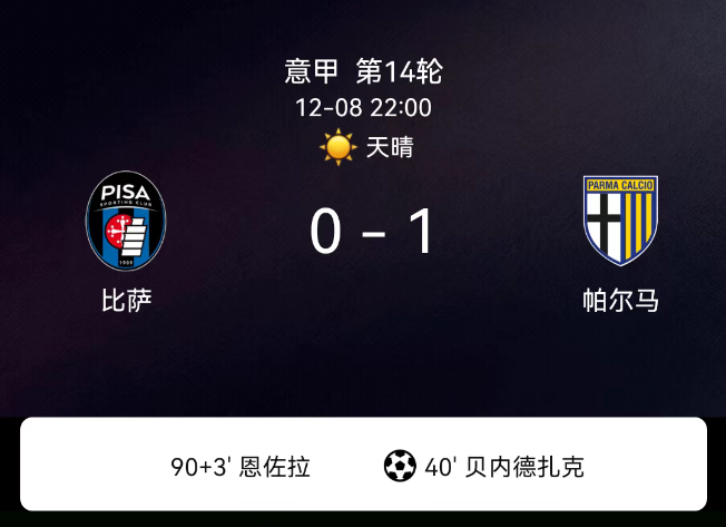 北京时间12月8日,2025-2026赛季意甲第14轮,比萨主场迎战帕尔马。第40分钟贝内迪恰克点射,0-1;第90+3分钟恩佐拉染红;双方各2黄,比萨1红。最终比分,比萨0-1帕尔马。关键事件第40分钟(进球):帕尔马客场领先!….....