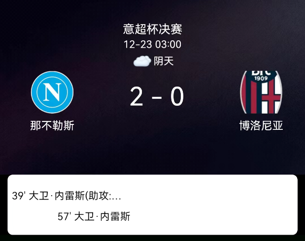 北京时间12月23日,意大利超级杯决赛,那不勒斯对阵博洛尼亚。第39分钟内雷斯世界波破门,1-0;第45分钟黑格姆领黄;第59分钟内雷斯抢断搓射双响,2-0;全场共1黄、无红牌。最终比分,那不勒斯2-0博洛尼亚。关键事件….....