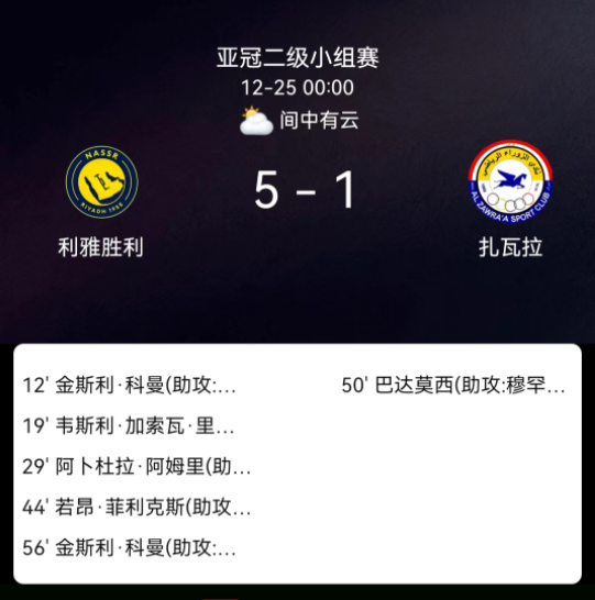 亚冠二级联赛第6轮C罗助攻利雅得胜利51祖拉全胜出线