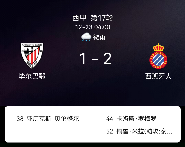 北京时间12月23日,2025赛季西班牙足球甲级联赛第17轮,毕尔巴鄂竞技主场对阵西班牙人。第28分钟德加拉雷塔领黄;第38分钟贝伦格尔破门,1-0;第44分钟罗梅罗扳平,1-1;第53分钟米利亚反超,2-1;全场共1黄、无红牌….....
