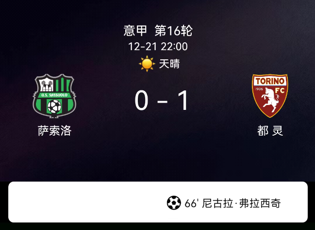 北京时间12月21日,2025赛季意大利足球甲级联赛第16轮,萨索洛主场对阵都灵。第35分钟萨索洛领首黄;第66分钟弗拉希奇点射破门,0-1;第82分钟都灵添1黄;双方共2黄、无红牌。最终比分,萨索洛0-1都灵。关键事件第35….....