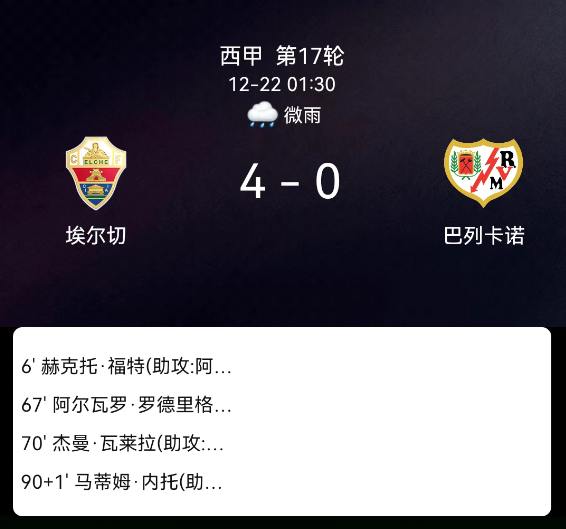 北京时间12月22日,2025赛季西班牙足球甲级联赛第17轮,埃尔切主场对阵巴列卡诺。第6分钟埃克托-福特破门,1-0;第67分钟阿尔瓦罗-罗德里格斯建功,2-0;第70分钟巴莱拉破门,3-0;补时第1分钟马蒂姆-内托锁定胜局,….....