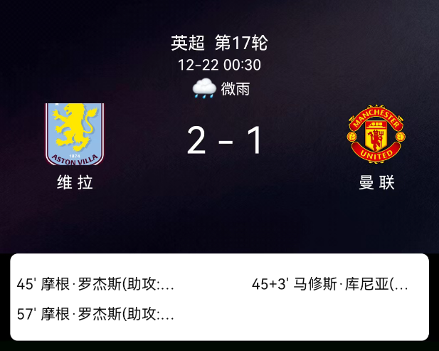 北京时间12月22日0:30,2025赛季英格兰足球超级联赛第17轮,阿斯顿维拉主场对阵曼联。第45分钟罗杰斯世界波破门,1-0;第45+3分钟库尼亚扳平,1-1;第57分钟罗杰斯双响制胜,2-1;第68分钟乌加特领黄;第72分钟达洛特….....