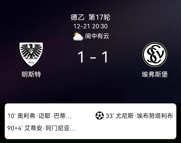 北京时间12月21日,2025赛季德国足球乙级联赛第17轮,纽伦堡主场对阵汉诺威96。第31分钟纽伦堡领首黄;第19分钟凯尔曼破门,0-1;第44分钟卢巴赫扳平,1-1;第49分钟穆罕默德-佐马反超,2-1;全场共6黄、无红牌。最终….....