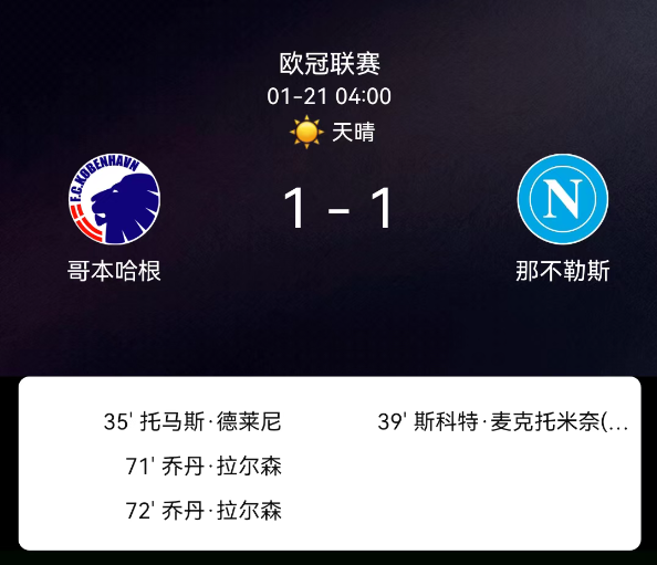 北京时间1月21日,欧洲冠军联赛联赛阶段第7轮,哥本哈根主场对阵那不勒斯。第34分钟德莱尼染红;第39分钟麦克托米奈破门,0-1;第71分钟拉尔森补射破门,1-1;双方无其他红黄牌。最终比分,哥本哈根1-1那不勒斯。关键….....