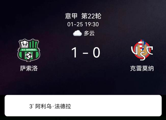 北京时间1月25日,意大利足球甲级联赛第22轮,萨索洛主场对阵克雷莫内塞。第3分钟法代拉破门1-0;双方无红黄牌。最终比分,萨索洛1-0克雷莫内塞。关键事件第3分钟(进球):萨索洛闪击制胜!法代拉破门建功,为主队拿….....