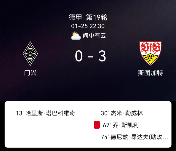 北京时间1月25日,德国足球顶级联赛第19轮,门兴格拉德巴赫主场对阵斯图加特。第30分钟莱韦林破门0-1;第67分钟斯卡利乌龙0-2;第74分钟昂达夫破门0-3;双方无红黄牌。最终比分,门兴格拉德巴赫0-3斯图加特。关键事件….....