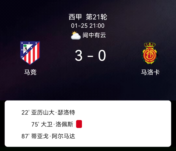 北京时间1月25日,西班牙足球甲级联赛第21轮,马德里竞技主场对阵马略卡。第22分钟瑟洛特破门1-0;第75分钟洛佩斯乌龙2-0;第87分钟阿尔马达破门3-0;希门尼斯、洛佩斯染黄无红牌。最终比分,马德里竞技3-0马略卡。关….....