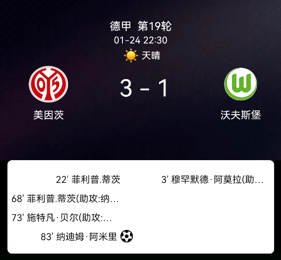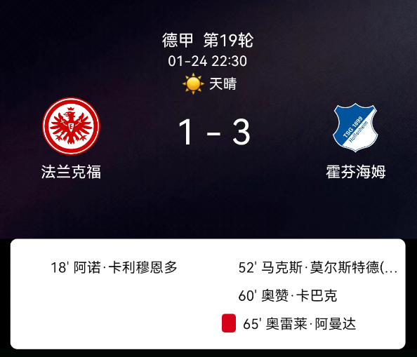 北京时间1月24日,德国足球顶级联赛第19轮,法兰克福主场对阵霍芬海姆。第18分钟卡利穆恩多破门1-0;第52分钟莫尔施泰特破门1-1;第60分钟卡巴克破门1-2;第65分钟阿门达乌龙1-3;双方无红黄牌。最终比分,法兰克福1….....
