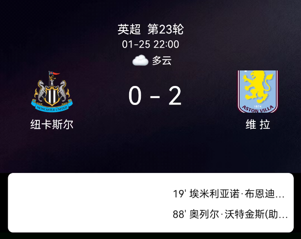 北京时间1月25日,英格兰足球超级联赛第23轮,纽卡斯尔联主场对阵阿斯顿维拉。第19分钟布恩迪亚破门0-1;第88分钟沃特金斯破门0-2;马特森染黄无红牌。最终比分,纽卡斯尔联0-2阿斯顿维拉。关键事件第19分钟(进球)….....