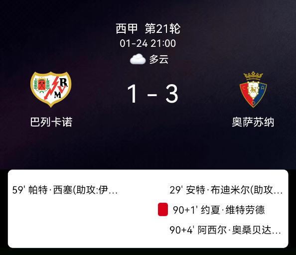 北京时间1月26日,西班牙足球甲级联赛第21轮,皇家社会主场对阵塞尔塔。第17分钟奥亚萨瓦尔破门1-0;补时2分钟卡莱塔-卡尔红牌;第72分钟伊格莱西亚斯破门1-1;第75分钟奥亚萨瓦尔破门2-1;补时6分钟门德斯点射3-1。….....
