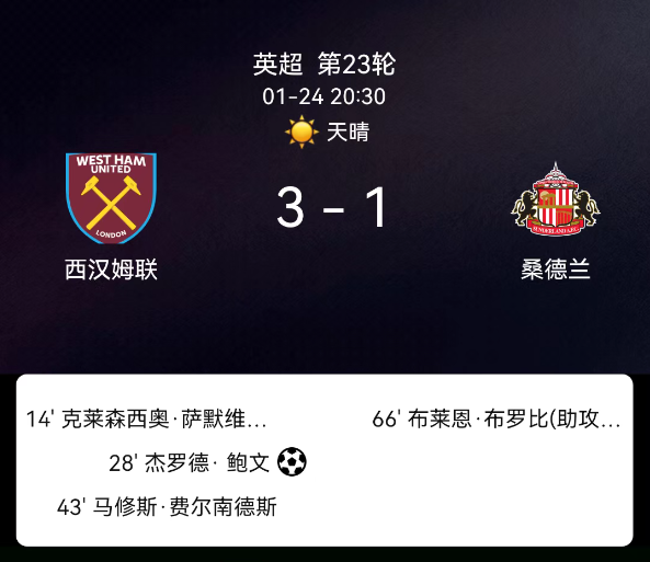 北京时间1月25日,英格兰足球超级联赛第23轮,布伦特福德主场对阵诺丁汉森林。第12分钟热苏斯破门0-1;第80分钟阿沃尼伊破门0-2;双方无红黄牌。最终比分,布伦特福德0-2诺丁汉森林。关键事件第12分钟(进球):诺丁….....