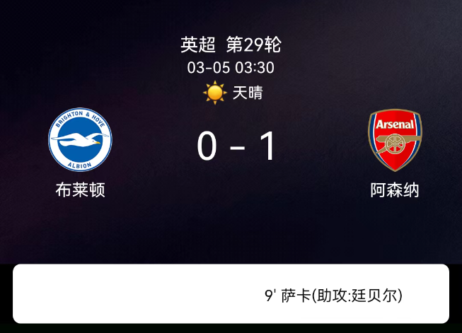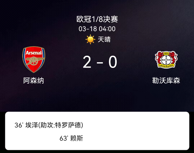 北京时间3月18日05:51,欧冠1/8决赛次回合,阿森纳主场迎战勒沃库森。上半场枪手占据主动,特罗萨德多次射门制造威胁,第36分钟埃泽轰出禁区外凌空世界波打破僵局。下半场第63分钟,赖斯禁区外兜射直挂死角扩大比分。….....