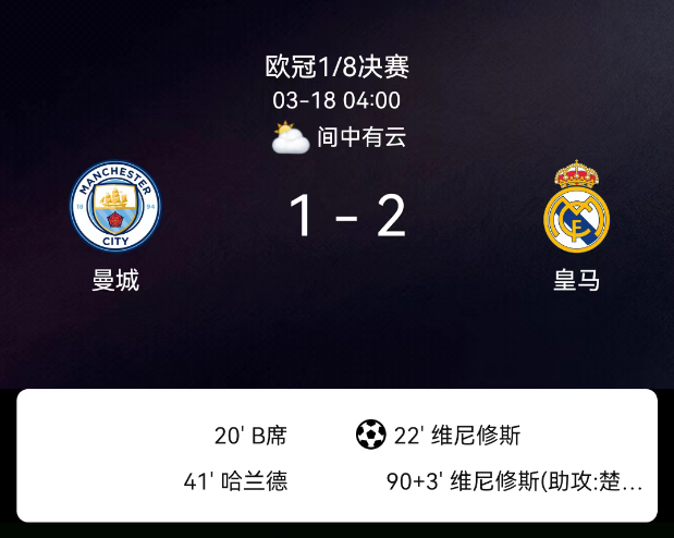 北京时间3月18日05:55,欧冠1/8决赛次回合,曼城主场迎战皇家马德里。第22分钟b席手球被判红点套餐,维尼修斯点射命中,皇马总比分4-0领先。第41分钟多库过人后助攻哈兰德破门,曼城扳回一城。下半场双方激烈对抗,多….....
