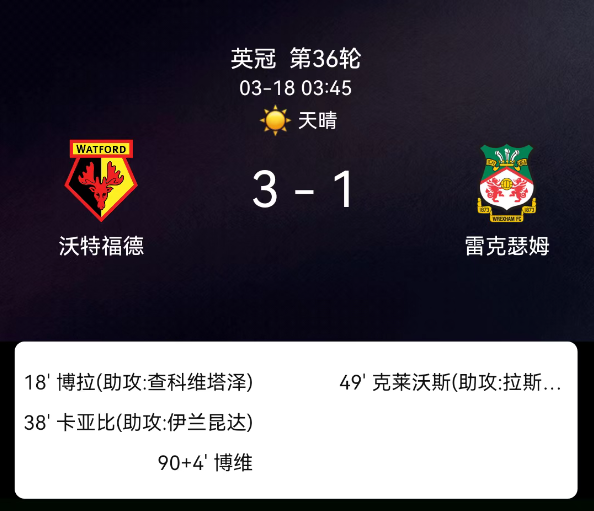 北京时间3月18日05:43,英格兰足球冠军联赛第36轮,沃特福德主场迎战雷克瑟姆。第18分钟查克维塔泽助攻马克-博拉破门,沃特福德先拔头筹。第38分钟伊兰昆达送出助攻,埃多-卡延贝扩大比分。第49分钟拉思伯恩助攻马克….....