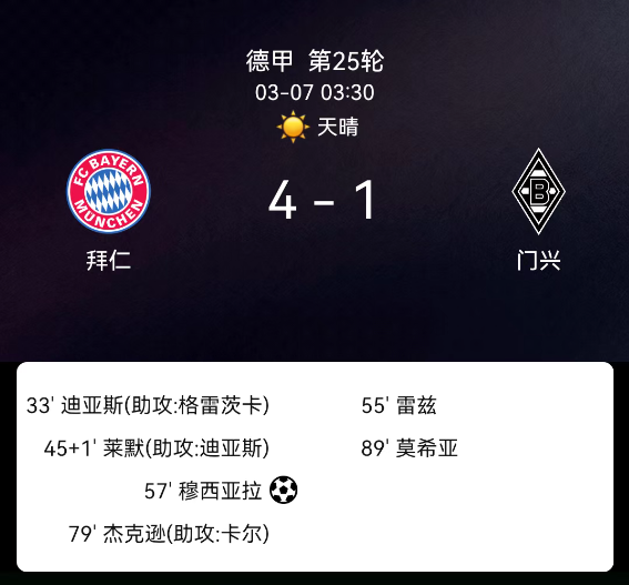 北京时间3月7日,德国足球甲级联赛第25轮展开角逐,拜仁慕尼黑坐镇主场迎战门兴格拉德巴赫。上半场第32分钟,格雷茨卡挑传助攻路易斯-迪亚斯凌空抽射破门,第45分钟迪亚斯回传助攻莱默尔再下一城。下半场第57分钟,雅….....