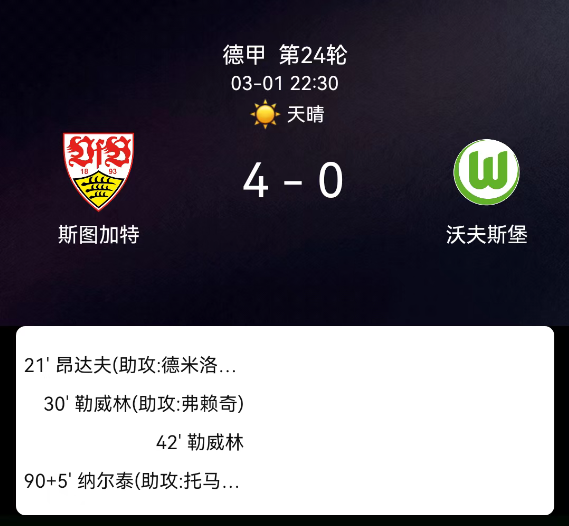 北京时间3月1日德甲第24轮,斯图加特对阵沃尔夫斯堡。第21分钟昂达夫破门1-0;第30分钟莱韦林破门2-0;第42分钟莱韦林再入3-0;补时阶段纳尔泰破门4-0;双方无红黄牌。最终比分,斯图加特4-0沃尔夫斯堡。关键事件第2….....