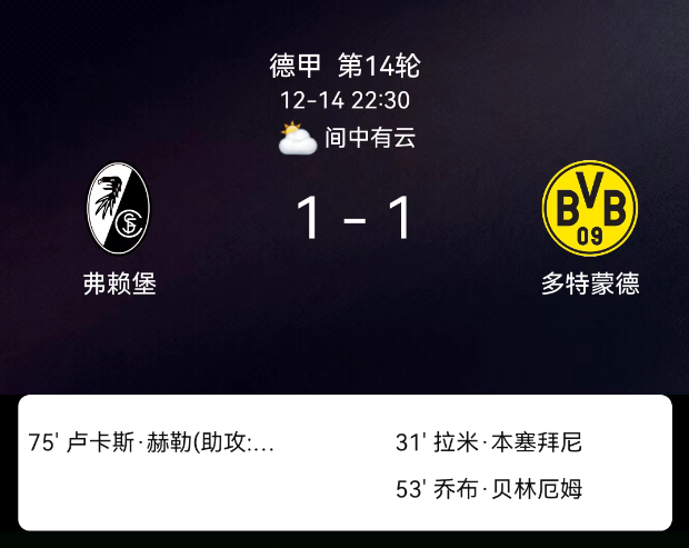 北京时间12月14日,2025赛季德国足球甲级联赛第14轮,弗赖堡主场对阵多特蒙德。第31分钟本塞拜尼破门,0-1;第53分钟小贝林厄姆染红,多特10人作战;第75分钟霍勒扳平,1-1;弗赖堡3黄、多特蒙德2黄1红;最终比分,弗….....