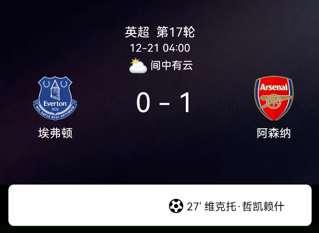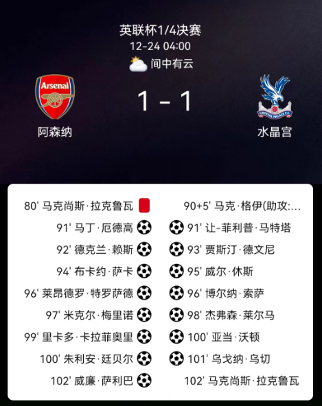 北京时间12月24日4:00,英联杯1/4决赛,阿森纳主场对阵水晶宫。第80分钟拉克鲁瓦自摆乌龙,1-0;第90+5分钟格伊破门扳平,1-1;双方无红黄牌;点球大战阿森纳9-8胜出。最终比分,阿森纳1-1(点球9-8)水晶宫。关键事….....