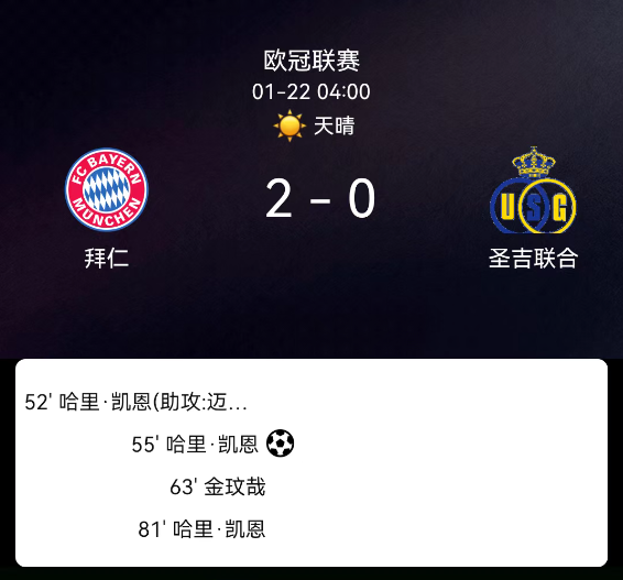 北京时间1月22日,欧洲冠军联赛联赛阶段第7轮,拜仁慕尼黑主场对阵圣吉联合。第52分钟凯恩破门,1-0;第55分钟凯恩点射,2-0;第63分钟金玟哉染红;多人染黄。最终比分,拜仁慕尼黑2-0圣吉联合。关键事件第52分钟(进….....