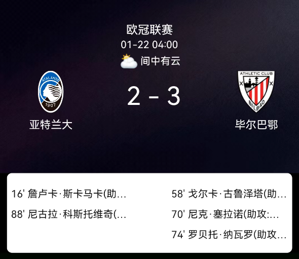 北京时间1月22日,欧洲冠军联赛联赛阶段第7轮,亚特兰大主场对阵毕尔巴鄂竞技。第16分钟斯卡马卡破门,1-0;第58分钟古鲁泽塔破门,1-1;第70分钟塞拉诺破门,1-2;第74分钟纳瓦罗破门,1-3;第88分钟克尔斯托维奇破….....