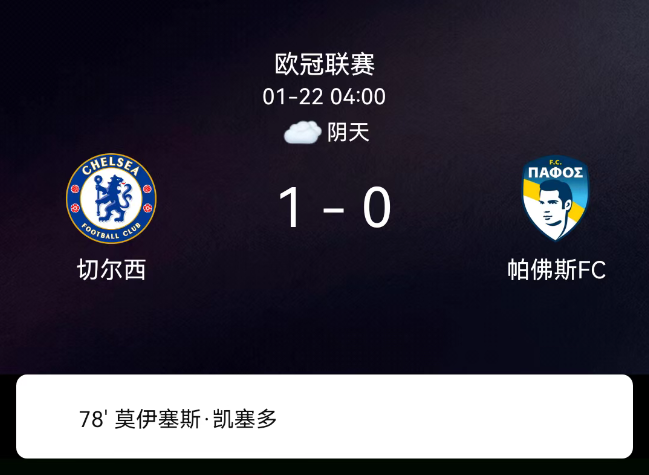 北京时间1月22日,欧洲冠军联赛联赛阶段第7轮,切尔西主场对阵帕福斯。第78分钟凯塞多破门,1-0;双方无红黄牌。最终比分,切尔西1-0帕福斯。关键事件第17分钟(无效进球):恩佐头球破门,裁判判罚进攻犯规,进球被….....