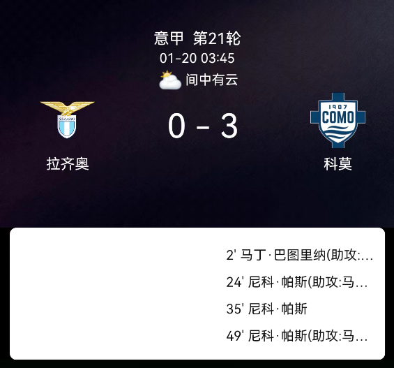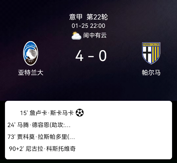 北京时间1月25日,意大利足球甲级联赛第22轮,亚特兰大主场对阵帕尔马。第15分钟斯卡马卡点射1-0;第24分钟德容恩破门2-0;第73分钟拉斯帕多里破门3-0;补时2分钟克尔斯托维奇破门4-0;斯卡马卡染黄无红牌。最终比分….....