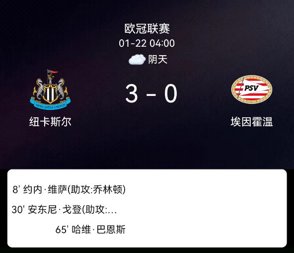 北京时间1月25日,英格兰足球超级联赛第23轮,纽卡斯尔联主场对阵阿斯顿维拉。第19分钟布恩迪亚破门0-1;第88分钟沃特金斯破门0-2;马特森染黄无红牌。最终比分,纽卡斯尔联0-2阿斯顿维拉。关键事件第19分钟(进球)….....