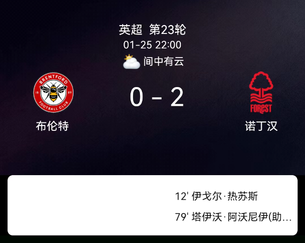北京时间1月25日,英格兰足球超级联赛第23轮,布伦特福德主场对阵诺丁汉森林。第12分钟热苏斯破门0-1;第80分钟阿沃尼伊破门0-2;双方无红黄牌。最终比分,布伦特福德0-2诺丁汉森林。关键事件第12分钟(进球):诺丁….....