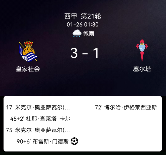 北京时间1月26日,西班牙足球甲级联赛第21轮,皇家社会主场对阵塞尔塔。第17分钟奥亚萨瓦尔破门1-0;补时2分钟卡莱塔-卡尔红牌;第72分钟伊格莱西亚斯破门1-1;第75分钟奥亚萨瓦尔破门2-1;补时6分钟门德斯点射3-1。….....