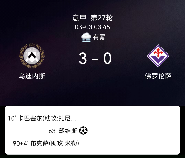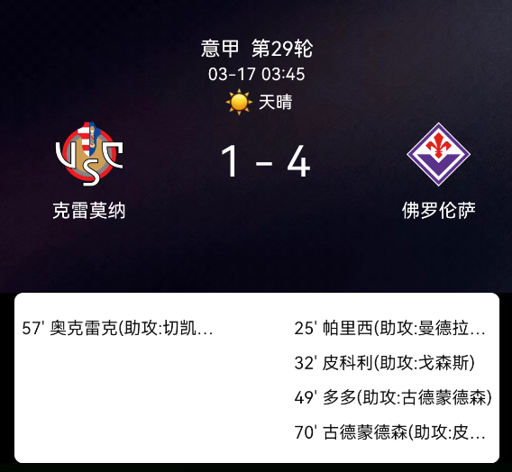北京时间3月17日05:38,意大利足球甲级联赛第29轮,克雷莫内塞主场迎战佛罗伦萨。上半场第25分钟帕里西晃开角度低射打破僵局,第32分钟皮科利单刀巧射扩大比分。下半场第49分钟多多上演半场一条龙破门,佛罗伦萨3-0领….....