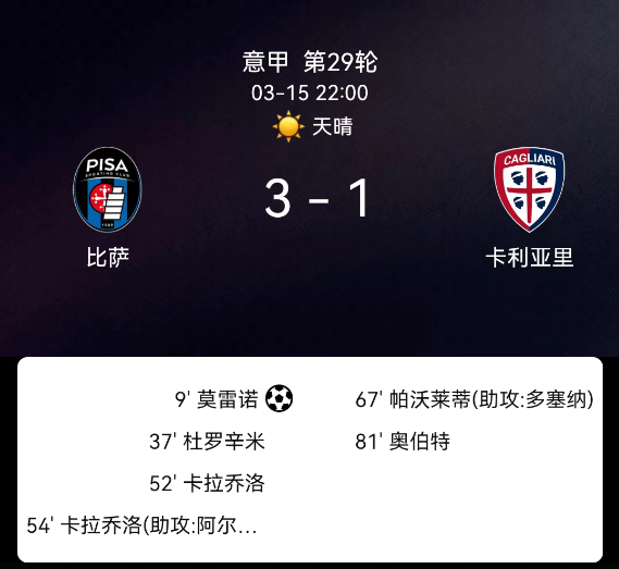 北京时间3月15日23:59,意大利足球甲级联赛第29轮展开较量,比萨主场迎战卡利亚里。第9分钟莫雷奥主罚点球命中,为比萨取得1-0领先。第37分钟杜罗辛米被直红罚下,比萨少一人作战。下半场比萨攻势不减,第52分钟卡拉….....