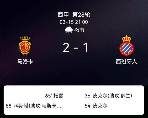 北京时间3月15日22:58,西班牙足球甲级联赛第28轮展开较量,马略卡主场迎战西班牙人。上半场第36分钟,多兰助攻皮克尔率先破门,西班牙人客场取得1-0领先。局势在第54分钟发生突变,皮克尔犯规被直接红牌罚下,西班牙….....