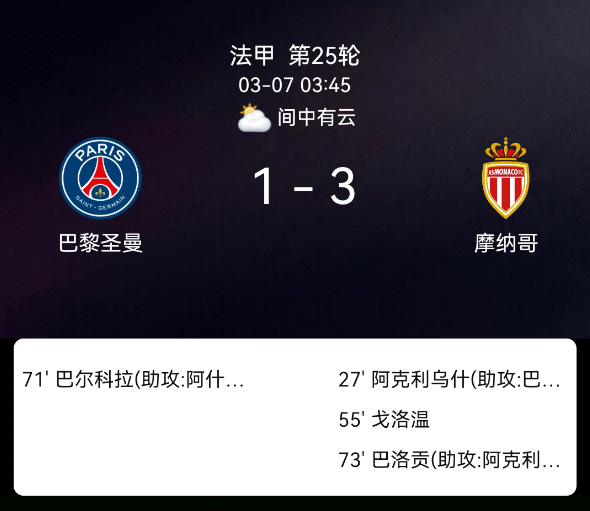 法甲第25轮阿克利乌什巴洛贡传射摩纳哥31客胜巴黎