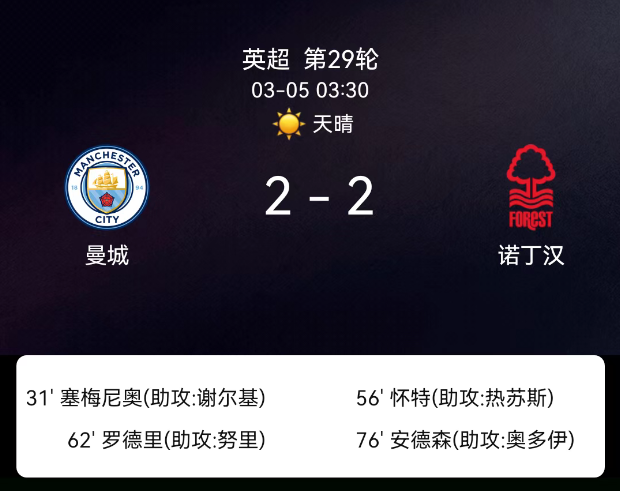 北京时间3月5日,英格兰足球超级联赛第29轮迎来焦点对决,曼城主场迎战诺丁汉森林。上半场第31分钟,谢尔基助攻塞门约凌空破门为森林先声夺人;下半场第57分钟,吉布斯-怀特凭借精彩脚后跟进球扳平比分,第62分钟罗德….....