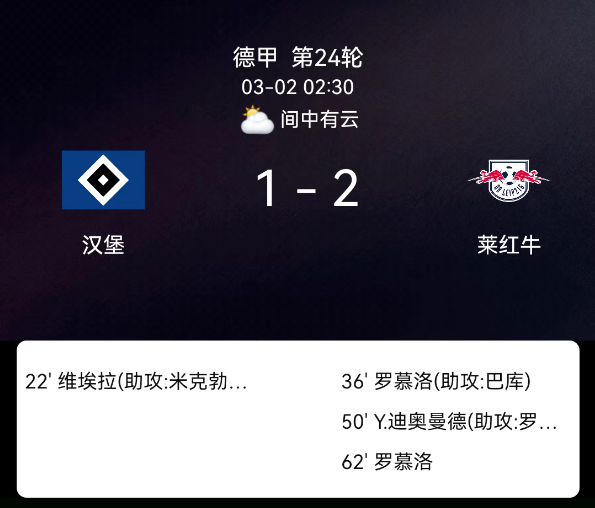 北京时间3月1日德甲第24轮,斯图加特对阵沃尔夫斯堡。第21分钟昂达夫破门1-0;第30分钟莱韦林破门2-0;第42分钟莱韦林再入3-0;补时阶段纳尔泰破门4-0;双方无红黄牌。最终比分,斯图加特4-0沃尔夫斯堡。关键事件第2….....