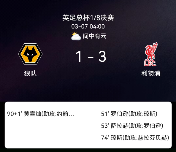 北京时间3月7日,英格兰足总杯1/8决赛,利物浦对阵狼队。上半场双方均无建树,下半场第51分钟罗伯逊远射打破僵局,第53分钟他助攻萨拉赫破门扩大比分,第75分钟琼斯兜射破门锁定胜局,第90分钟黄喜灿打入安慰球。最终….....